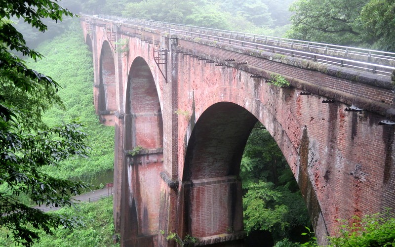 Now, between Yokokawa Station (at the end of the Shinetsu Line from Takasaki Station) there is a walking trail that follows the route of the old railway line up to Kumanodaira Station. At one point the trail passes over Megane-bashi, a red-brick viaduct built at the start of Japan's industrial revolution in the late 1800s.