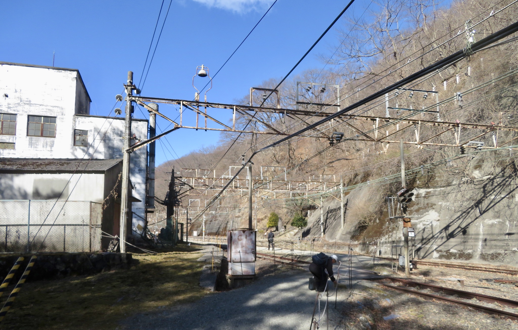 At the junction a couple of hundred metres beyond the tunnel, one track (left) drops down toward Shimonita while the other (right) goes for several kilometres in the direction of Karuizawa. If you manage to get as far as the pylon and power lines you can look out towards the Usui-Karuizawa exit of the expressway and across to the Mt Asama volcano, behind Karuizawa. At this point you will be about 15 km from Yokokawa Station.