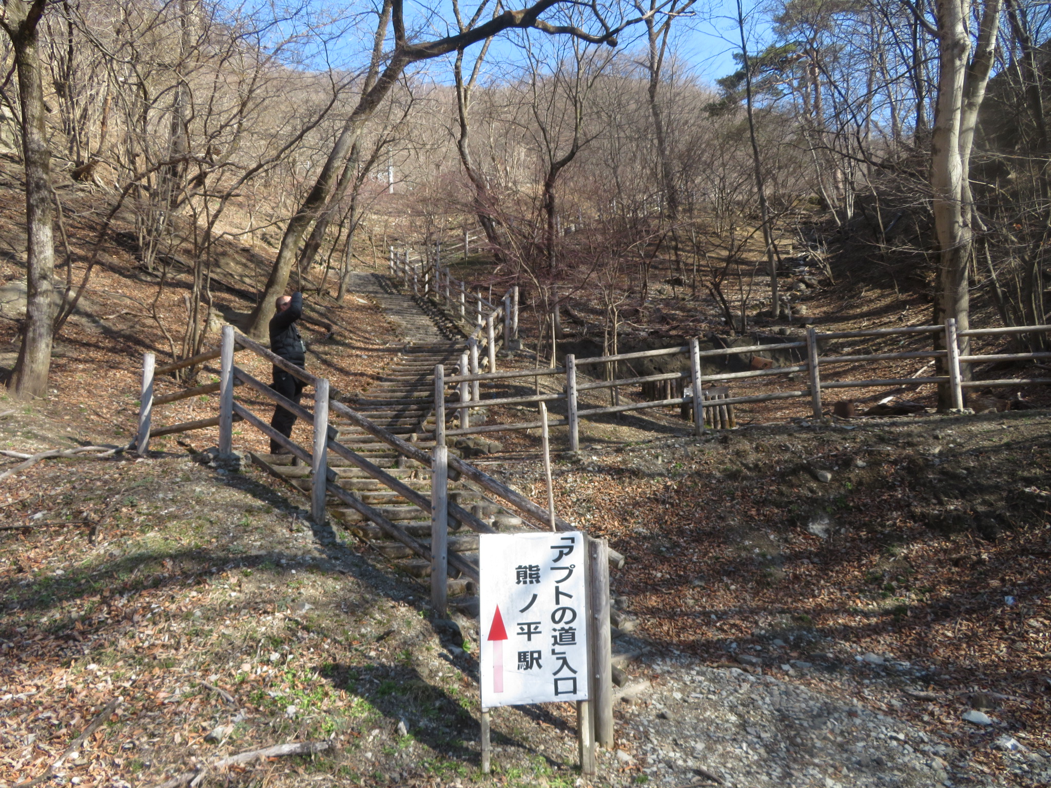 It is a pleasant hike — a gentle rise up and a gentle descent back — to Kumanodaira at any time of the year. Under a blue winter sky, when the fresh green leaves break out in the spring, or during the autumn when the mountainsides are covered in seasonal finery of vivid shades of red, orange, yellow, brown and gold it is especially rewarding. But for those who do not want to walk and who have their own transportation, there is a car park right below.