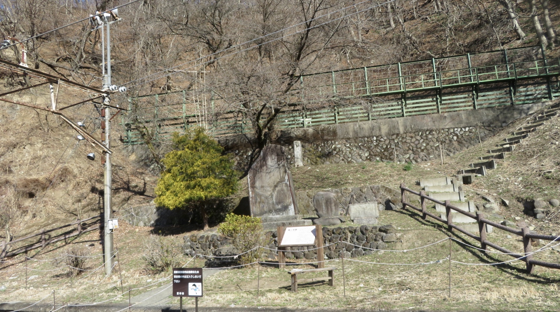On the opposite side of Route 18 from the car park/bus stop there is a short but steep set of steps to climb. Above the final step it is level ground, and the immediate area around the old station buildings is only about 200 metres long so there are no long hiking trails to worry about — but it is nice to walk through the tunnel and go as far as Megane-bashi, which will take an hour or so there and back.