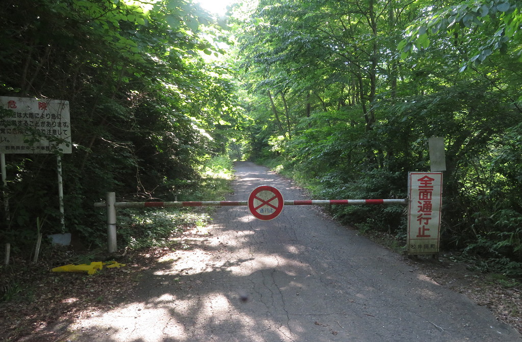 The entrance to the forest track is just metres from the bridge in front of the now-closed Myogi Kokuminshukusha (inn). The track (林道) snakes its way up through the valley and eventually joins a second track just beyond Myogi Tunnel (妙義隧道 Map: 36.282118, 138.709247), which is about 5 km from the barrier at the bridge.