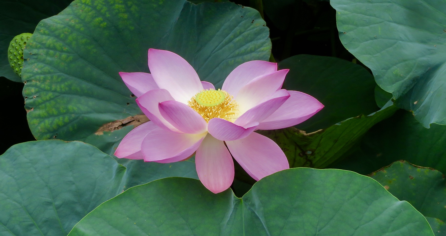 Timing is everything, and from about mid-July until early August, the surface of the pond is covered with the large leaves of lotus plants and, on long, slender stalks above them, an equally eye-catching array of pink flowers.