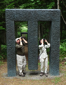 Here visitors Larry and Yurika Geffin enjoy birding in the grounds of Arte Piazza Bibai, Hokkaido, where Kan Yasuda's monumental sculptures are presented in a wonderful natural setting complete with woodpeckers, flycatchers and squirrels.