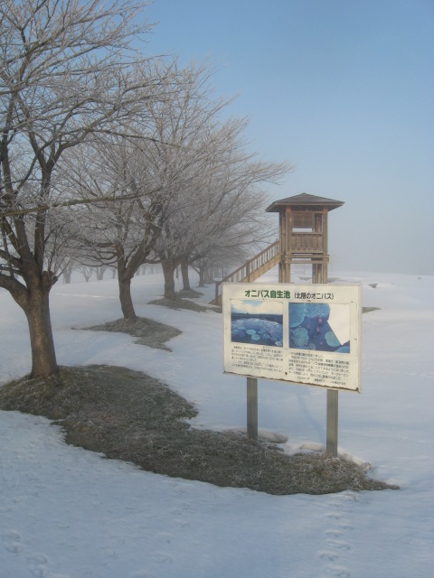 Nearby is Ganbaresha (雁晴れ舎), a birdwatching hide (with toilet facilities and a car park) which offers extensive views over the whole area. The open roof is a great place from where to watch the ducks and geese. Across the water, a dead tree often serves as a lookout and roosting site for White-tailed Eagles.