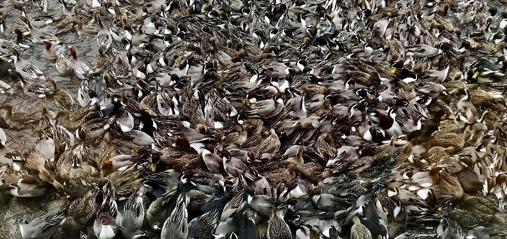 The commonest species, numbered in the thousands, are Northern Pintail, Eurasian Wigeon, Tufted Duck and Common Pochard. There are usually a few Smew or Goosander further out in the middle of the lake, and a careful search may reveal a Baikal Teal, a scarce winter visitor, among them. Rarities here have included Green-winged Teal among the Eurasian Teal, and Lesser Scaup.
