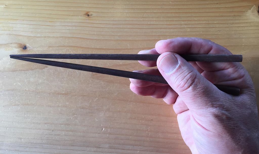 Japanese chopsticks are held lightly, as if painting water colours with a small brush, or drawing lightly with a crayon or pencil. The upper chopstick is held loosely with two fingers and the thumb; this is the one that moves. The lower chopstick rests on the fourth finger and at the base of the thumb; this one doesn't move.