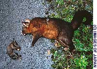 A possum roadkill victim in New Zealand, where the alien species virtually rates as a natural disaster. What disquieted the author, though, was that the adult female's newborn joey was still alive . . .