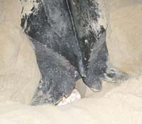 The third Leatherback I encountered (see accompanying photos) was another matter altogether. As I approached, she had already scraped out her shallow nest in the sand with her massive fore flippers. Then she delved down, stretching deeply with her massively muscular hind limbs to haul out sand and create a narrow but deep nest pot into which, as I watched, she deposited clusters of shiny, white, golfball-size eggs. Her egg-laying exertions finally over, she paused before filling in the special chamber with sand, scraping and pressing it down repeatedly until it was invisible. Only then did she bring her fore flippers back into play, pushing sand back into the main nest scrape with those massive paddles. Seemingly content with her efforts at protection and concealment, she rested again before heading back to sea.