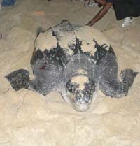 As I wandered along the beach, I at first almost missed the even darker shadow ahead of me in the darkness. Then, when my eyes adjusted, I realized that I could just make out enormous flippers flicking sand as a female Leatherback Turtle made a trial nest excavation. I felt elated to finally see this fabulous animal, a marine reptile now endangered throughout its entire range.