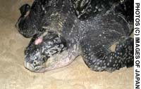 The turtle lays eggs into a chamber scooped out by its massive hind flippers.