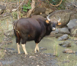 After it had rested, then scented various tree boles, the young tiger slipped away between the sal trees and was gone, so we set off once more, to find whatever presented itself. In a narrow rocky ravine, thick with bamboo, we came upon India’s answer to the bison, otherwise known as gaur. They are huge, stocky yet very attractive creatures that live in family groups in thick forest, so despite their size they can be extremely difficult to see. And these were my first sightings ever!