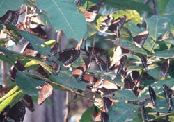 The butterflies were ascending in a swirling column into the dappled sunlight, like smoke rising from a leafy fire. As I rapidly scanned around, I found the nearby tree branches were drooping under the weight of butterflies, clustering in their thousands. Even more were roosting, it seemed, than had taken wing. It was as if an autumnal tree that was ready to shed its leaves suddenly cast them upward into the light, instead of letting them fall to the forest floor.