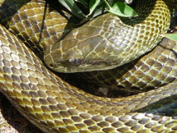 Strong sunshine and warm days bring out snakes, skinks and lizards to bask. I found the five-lined skink (Eumeces sp.), pictured here, enjoying warming sunshine recently behind the wonderful Itsukushima Shrine on Miyajima Island in Hiroshima Prefecture. I was more amused to find this Japanese ratsnake, or aodaisho (Elaphe climacophora) (pictured) curling nonchalantly within arm’s reach of dozens of passers-by in Kenrokuen — the classically famous “strolling-garden” in Kanazawa, Ishikawa Prefecture. As each visitor stooped to photograph the lovely waterfall across the pond, or the koi in the pond at their feet, I thought that someone would surely notice this prize creature so close. Even despite my own antics — grovelling to get down low enough to photograph it — no-one asked me, nor investigated, what I was doing. Perhaps foreigners are always grovelling on their knees in Kenrokuen? Unperturbed by any of this, however, the snake basked on in the warming sunlight.
