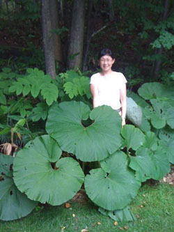 Butterbur flowers are among the very first to appear here, pushing up from the still chilly soils in early spring in concert with the creamy white flutes of giant skunk cabbage (Lysichiton camtschatcense), known as mizu-bashou in Japanese, that appear along streamsides and in swampy areas from Honshu to eastern Siberia. The elongate, sky-pointing leaves of that plant continue to grow and enlarge, like the butterbur, long after flowering has finished — making the giant skunk cabbage yet another northern megaherb.