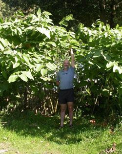 But that’s not all yet, for beyond the woods, in many sunlit patches across the land are to be found clumps of clattering stems, their tips nodding and bowing on the breeze and producing inflorescences of fine off-white flowers. This plant is infamous where it has been introduced abroad — and is actually deemed one of the 100 worst invasive plants worldwide — but here, both Japanese knotweed (Polygonum / Fallopia japonica) and giant knotweed (Polygonum / Fallopia sachalinense) are yet more native megaherbs.
