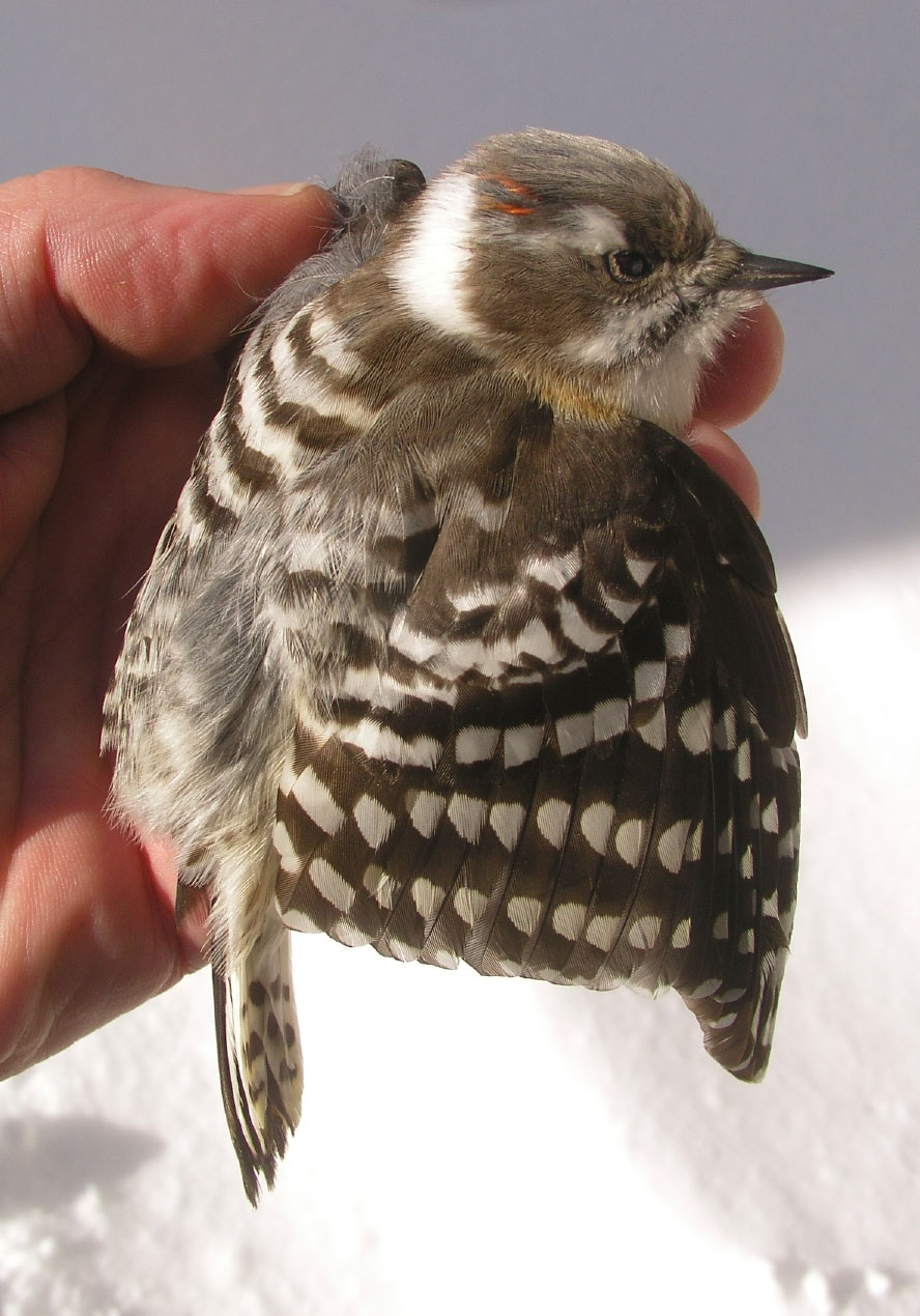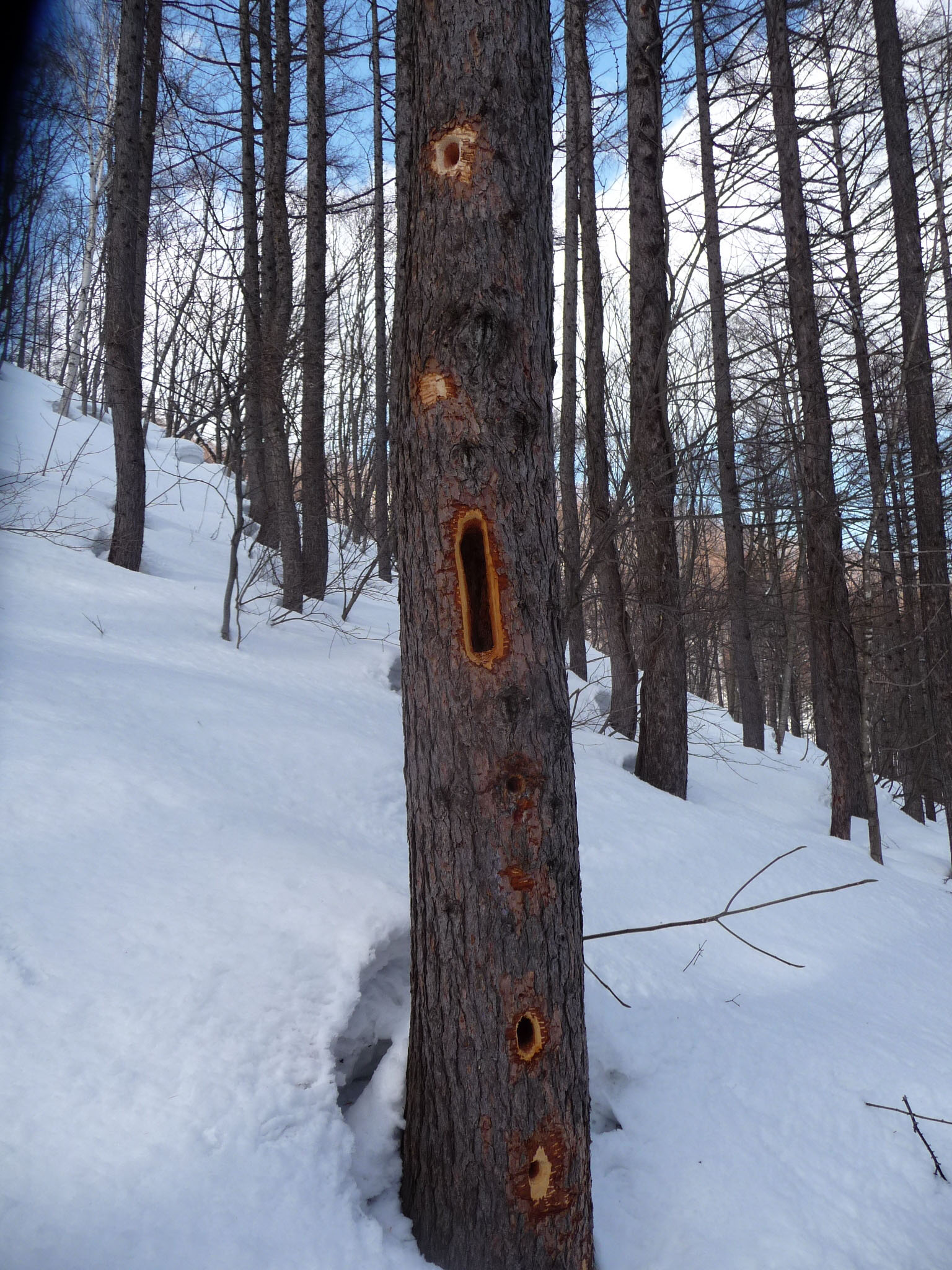 I recall once hearing a reverberating cannonade of blows in a forest in the Akan National Park of eastern Hokkaido. In the frigid winter air that morning, the blows carried far. Skiing closer, I located the bird high in a dead conifer. It was drumming hard on the rotten tree as I slid silently closer on my skis to a point where I could rest my ear against the trunk.