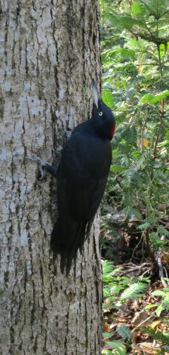 The Black Woodpecker of northern Japan is unusual in its predilection for foraging almost at ground level, low on large trunks and on fallen trees. Its loud “kree-ah, kree-ah, kree-ah” call given in flight carries far across the forest, giving away its presence, whereas other species tend to have abrupt sharp notes audible only from much closer.