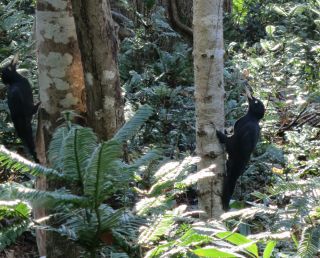 Together, these two black-clad creatures circle each other and the trunk, threatening, but maintaining a distance between them; ready, yet hesitant. They seem like a pair of medieval knights about to battle to the death. Yet, with nothing more than a rapid dance-like series of moves, it is as if they establish their ranks, their affiliations, their strengths and weaknesses — and suddenly, without coming to blows at all, the eerie contest is concluded and the devil dancers part, each to its own trunk. Equally as quickly, each returns to using its beak for its main purpose of food gathering.