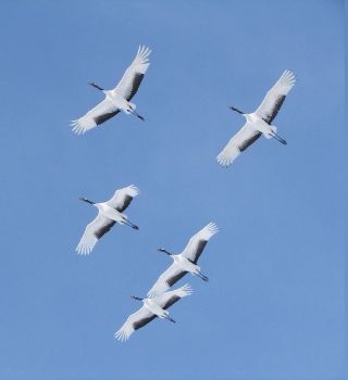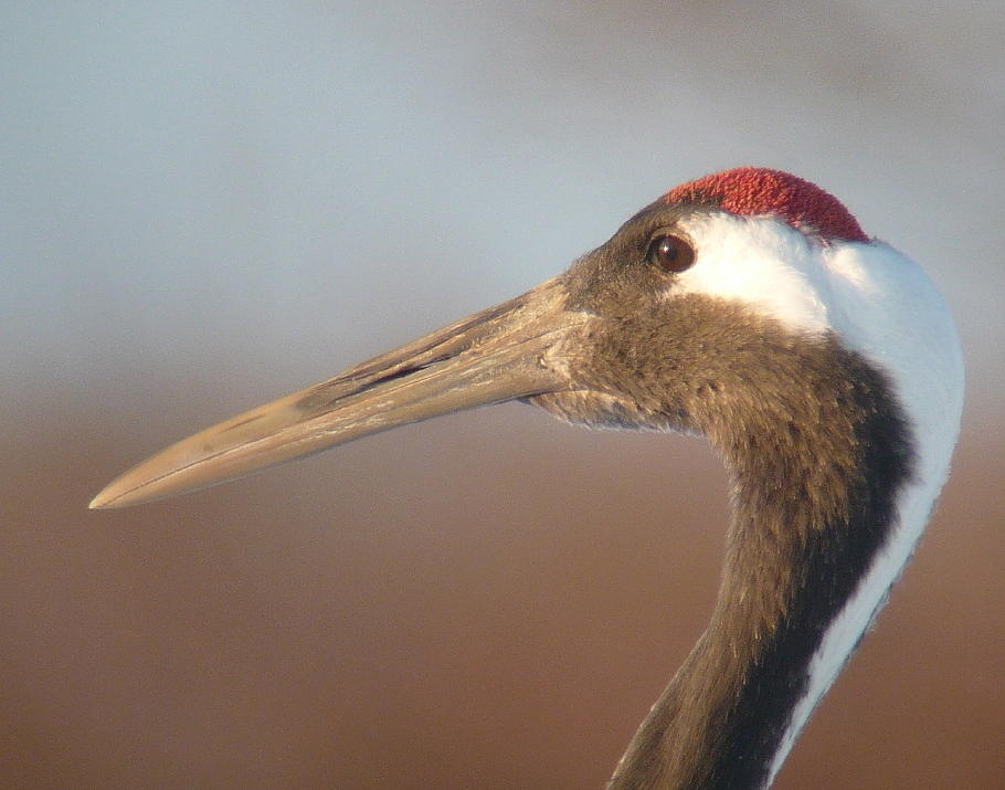 North America has two species, the Sandhill and Whooping cranes. South America has none at all. Europe has just one, the original, archetypal crane, the Common or Eurasian Crane known as Grus grus, named by Linnaeus. Africa has four breeding species, the Black-crowned, Grey-crowned, Wattled, and Blue cranes, though Demoiselle and Eurasian also winter on this continent. Australia has one, the Brolga. With nine species, Asia, however, can lay claim to the lion’s share of global cranes, as more than half of the world total breed there. Demoiselle, Common, Hooded, Red-crowned, Sarus, Siberian, Sandhill, White-naped and Black-necked cranes can all be claimed by Asia. Five species (Red-crowned, Hooded, White-naped, Common and Sandhill) appear annually in Japan, with two more (Demoiselle and Siberian) occurring here on rare occasions.