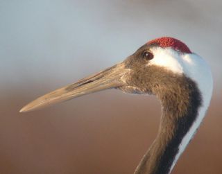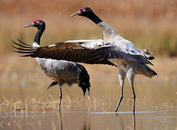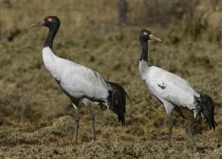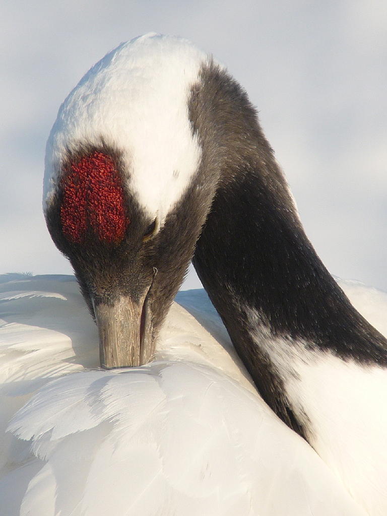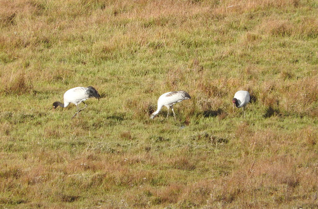 In flight the Red-crowned Crane reveals its true tail colour, which is white. Its wings too are largely white, with only the feathers of the inner wing being black. It is in fact these inner wing feathers that droop down over the tail, obscuring it, when the bird lands. The Black-necked Crane’s tail truly is black, though it too is hidden by the bird’s wing feathers when it is standing, and in flight it is an all-together darker bird than the Red-crowned Crane, with black wing feathers from tip to inner wing.