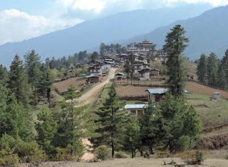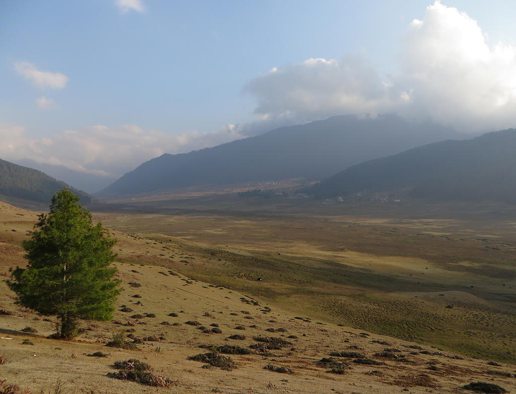 The monastery sits dramatically atop a small hill that overlooks the broad Phobjika Valley. The monastery is a large imposing structure, yet in the expansive landscape of the Himalayan outliers it is dwarfed. Distant hills rise ever higher in ranks that reach out and around, sheltering the valley of Phobjika. This valley is a traditional haven, one to which a migratory flock of Black-necked Cranes has been drawn for generations.