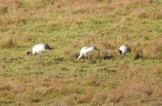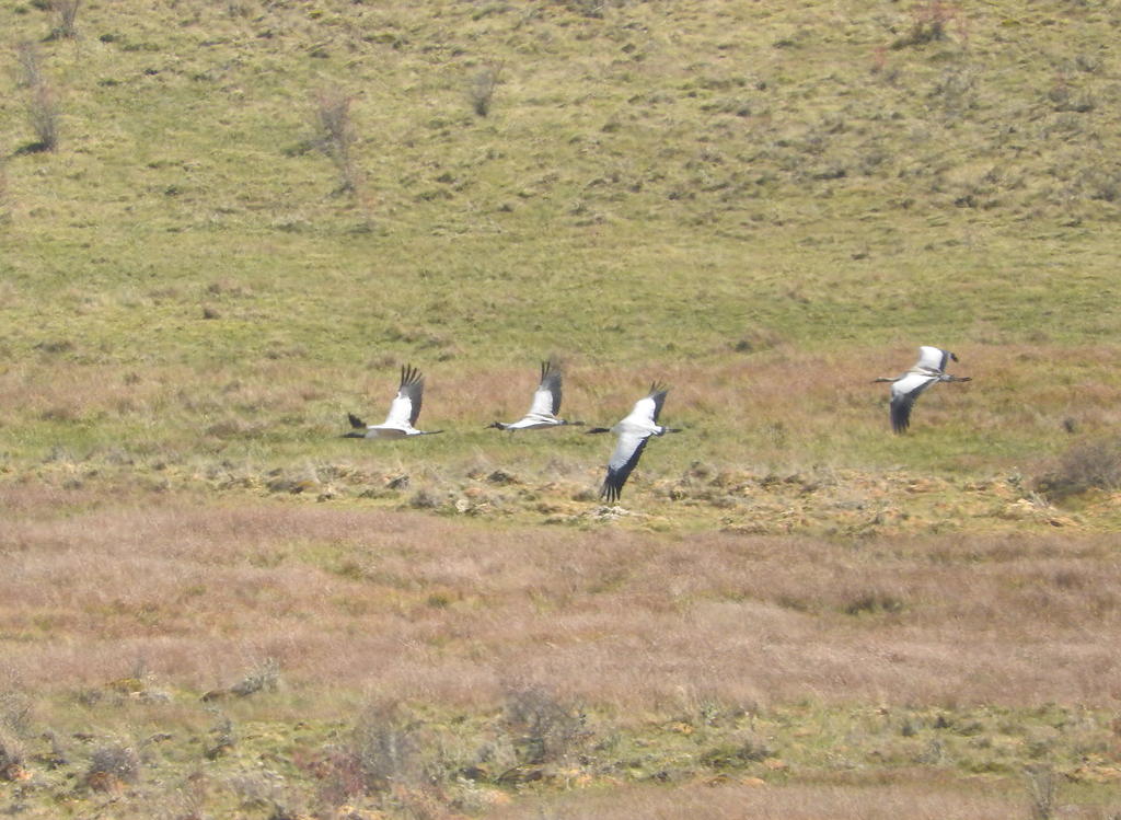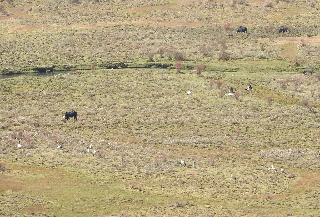 Through my binoculars I could make out ten or so, and once I trained my telescope on the same area I realised there were at least two-dozen, perhaps more. Family parties, parents with single chicks, were scattered amongst the flock, the young birds distinctive, lacking the black hood of their parents, and instead having a broad brown panel across the closed wings. These were my first Black-necked Cranes, and the distance didn’t matter a jot! I drank in the sight, marvelled at their sounds and counted and re-counted the flock in the valley until my eyes ached.