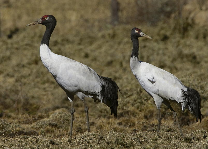 Whereas Japan’s “Bird of Happiness,” the Red-crowned Crane, sports a jaunty red beret atop a head and neck that are banded in white and black, with dark brown eyes at the margin of the black and white, Bhutan’s “Bird of Happiness,” the Black-necked Crane, has a red forehead and a completely black hood that extends down its neck. The latter’s creamy white eyes stand out against its black face, giving it an alert and somewhat wide-eyed, startled look. The Bhutanese bird is shorter than the Japanese crane, yet it too can stretch itself erect in a beautifully elegant pose. Both share a large bustle of feathers that, in standing birds, seem to sprout from the tail, arching and falling in a cascade of raven black.