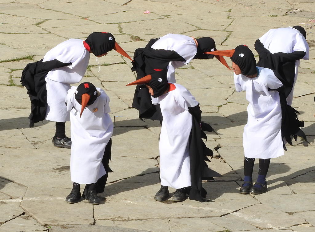 No Bhutanese festival would be complete without the beating of drums, blasts on tremendously long horns, and a tremendous display of masks during traditional masked dances, nor it seems without a couple of jesters admonishing the crowd with bawdy jokes and a large wooden phallus. In the case of the Phobjika Black-crowned Crane Festival, however, the more typical festival elements are interspersed with readings, with poetry and performances that celebrate the safe annual arrival of the cranes to the valley. Of those, the most charming was that performed by the local school children. Clad in simple white and black costumes, with black hoods decorated with pale eye-spots and long, carrot-like orange bills, the children sang and danced their way around the courtyard at times mimicking the calls, dances and feeding movements of the wild birds. Seeing that dance itself was worth the price of admission.