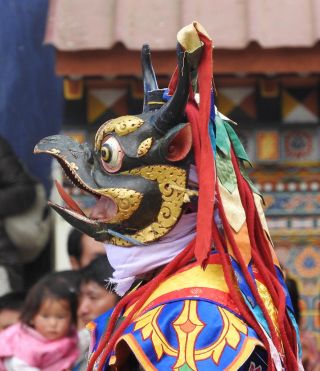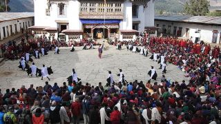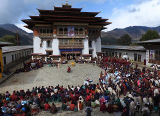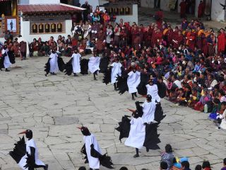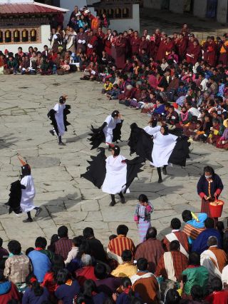 A few kilometres way, not cranes, but people were arriving. They were swelling in numbers too; the little street through the village below the goempa was now thronged with visitors. Bhutanese in their distinctive national costumes and foreigners in their colourful array of trekking and winter gear packed the roadway and the entrance to the monastery. As I joined the flow and inched inside it was to find the courtyard of the monastery ringed with an expectant audience. Buddhist festivals, Bhutanese-style, are as colourful and decorative as the monasteries themselves. The local audience is as fascinating as the subject of the festival, though in this case the combination of a religious festival, with a wildlife element and a conservation message, was compelling.