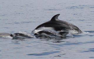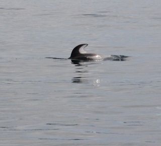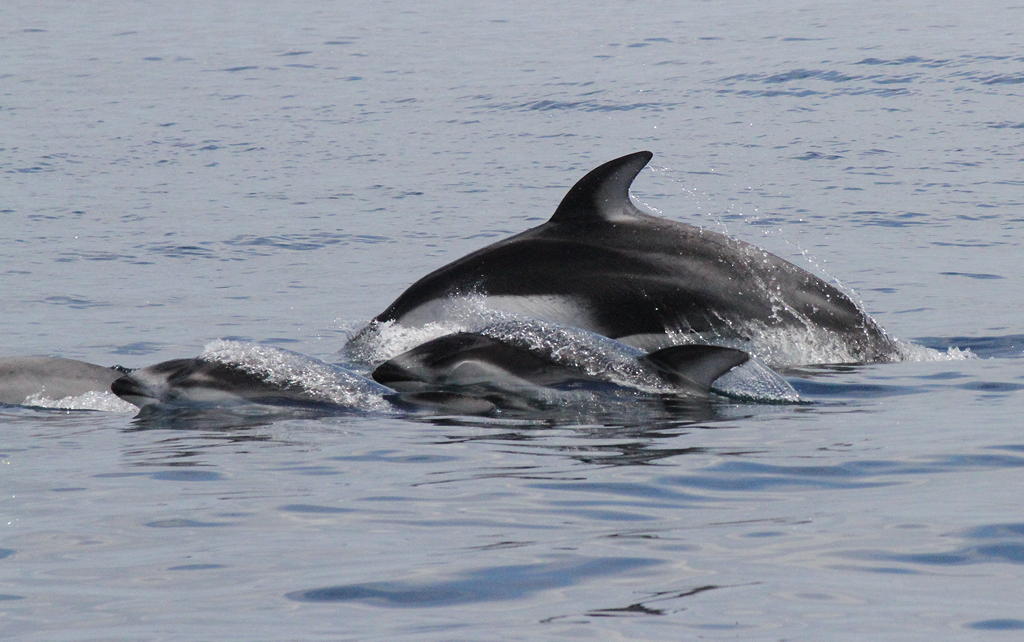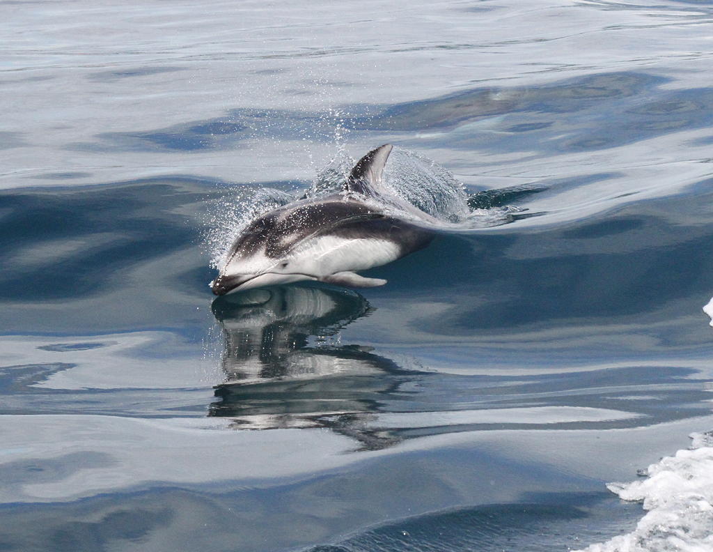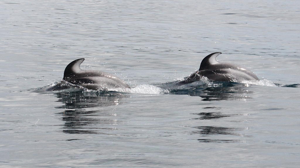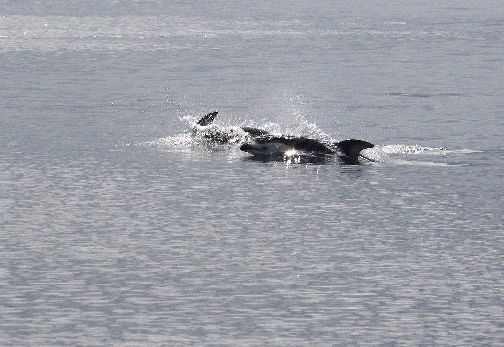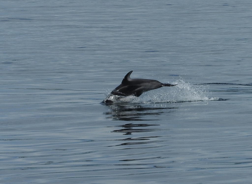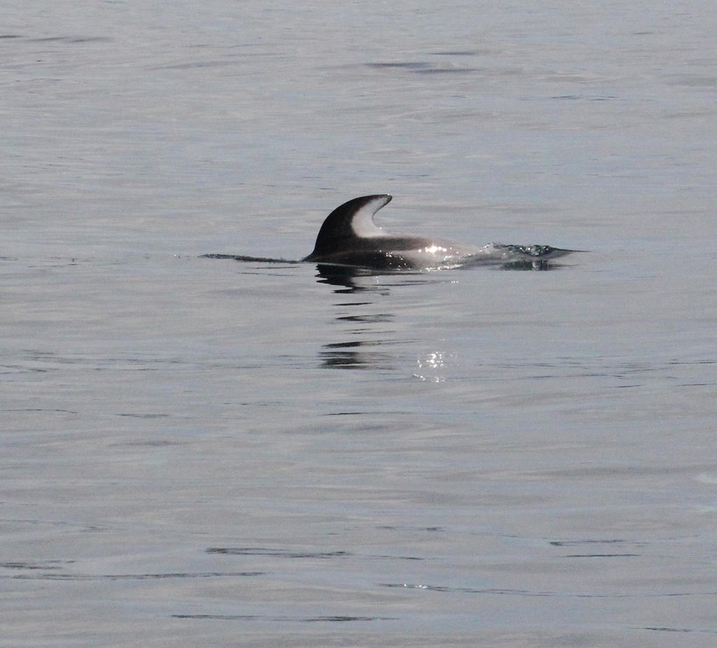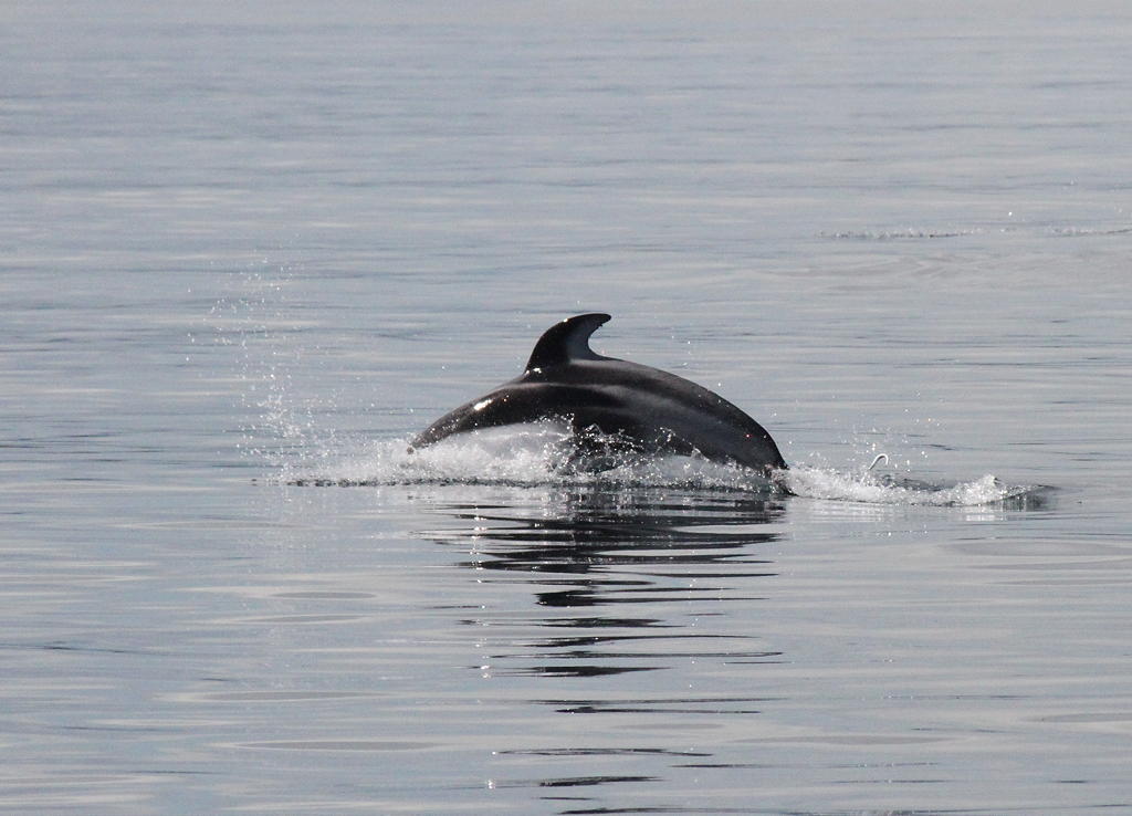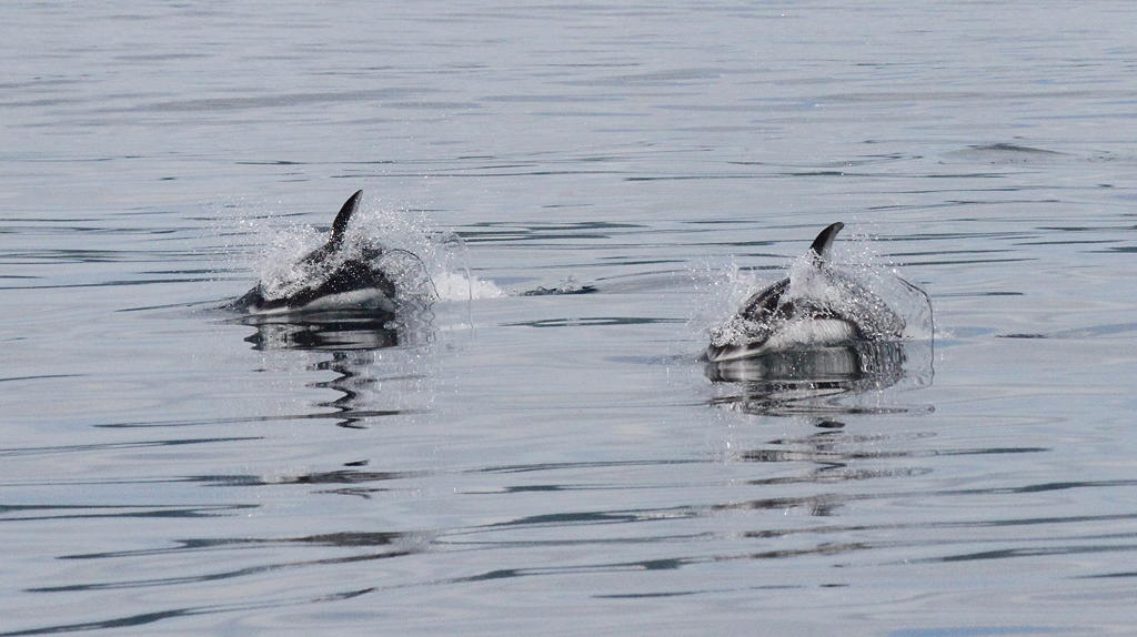 With the sun shining on Mt Shari and beyond that on the Shiretoko Peninsula clearly visible in the distance, we head out of the harbour. The sea surface is barely ruffled, which provides us with perfect opportunities for spotting anything in or on the water. Amazingly, within ten minutes of leaving our berth we spot splashes ahead and catch glimpses of several fast-moving creatures surging through the water. Within fifteen minutes we have not only clearly sighted the creatures, but have also confirmed their identities as Pacific White-sided Dolphins – the common dolphin of these waters. Had we been in the warm southern waters off the Ogasawara Islands we might have been watching very different dolphins, such as bottlenosed, spinner, or spotted, but up here in the north the two commonest small cetacean species are the energetic Pacific White-sided Dolphin and the even speedier Dall’s Porpoise.