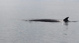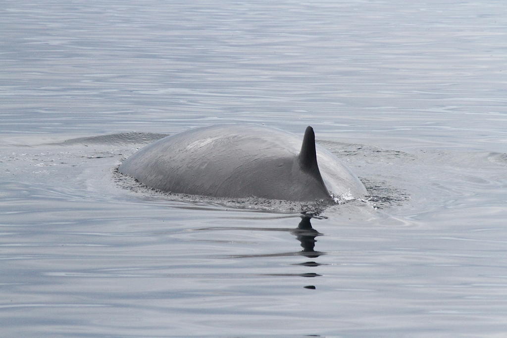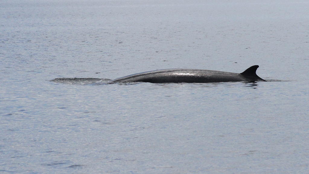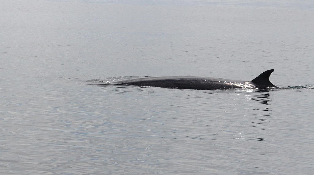 Ahead of us a low mounded back glistens, catching the light and glinting momentarily; then a short falcate fin appears and a split second later the entire animal disappears beneath the surface. In that brief moment it has exhaled and inhaled, recharging its oxygen supply, but more breaths will follow before it next dives to feed, and now we are ready! Spotting Minke Whales is like this, a glimpse here, a brief look there, but eventually we piece together identikit views then, providing the icing on our cetacean cake, they even linger close to us allowing us superb views of all their crucial details. We hear there exhalations, see the water streaming alongside their rostra, note their short pectoral fins (nothing like the long-limbed Humpbacks down south), and watch over and over again as each whale emerges and submerges ahead leading us on an erratic course across the bay.