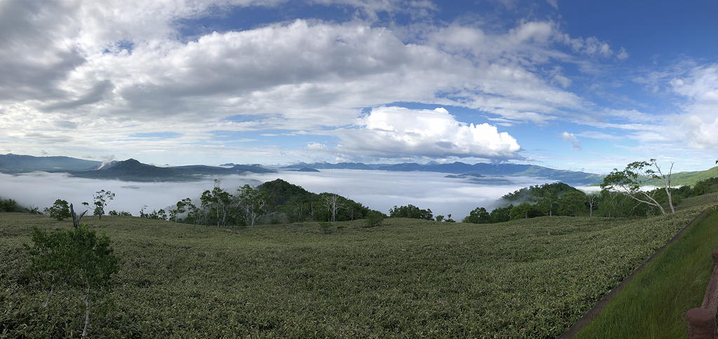 Blue above then blue below. Viewed from just below the pass at Mt Mokoto on the northern rim of the Kussharo Caldera, a low sea of cloud blankets Kussharo-ko, Japan’s largest caldera lake, from view. Beyond the rugged, forested far rim of the caldera to the southwest rises the peak of Mt O-Akan, while closer at hand to the southeast sulphurous steam billows from the Iwo-zan vents. Carpeting the foreground, a swathe of dwarf bamboo, lush in its yellow-fringed greenery, is dotted with majestic and hardy Erman’s Birches completing the breath-taking scene beneath an azure sky wreathed in cumulus.