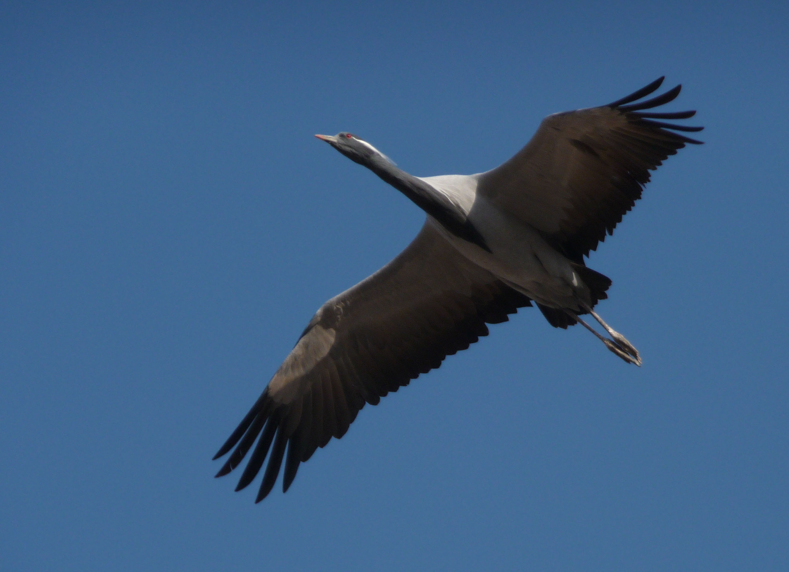 Breeding on steppes and similar habitats from the Baltic to Mongolia, Demoiselle Cranes are used to rarefied atmospheres, but they break records when they undertake their migrations, because many pass right over the Himalayas. Indeed, they have been filmed flying way above the 8,848-meter peak of Mount Everest. Warmly insulated in their cocoon of feathers, up as high as long-haul jets fly, they rebreathe air through their lungs and air sacs to extract the most posssible oxygen from it in a way only birds can. As well, they efficiently burn stored brown body fat as their “aviation fuel” — one of whose by-products is precious water, which staves off dehydration.