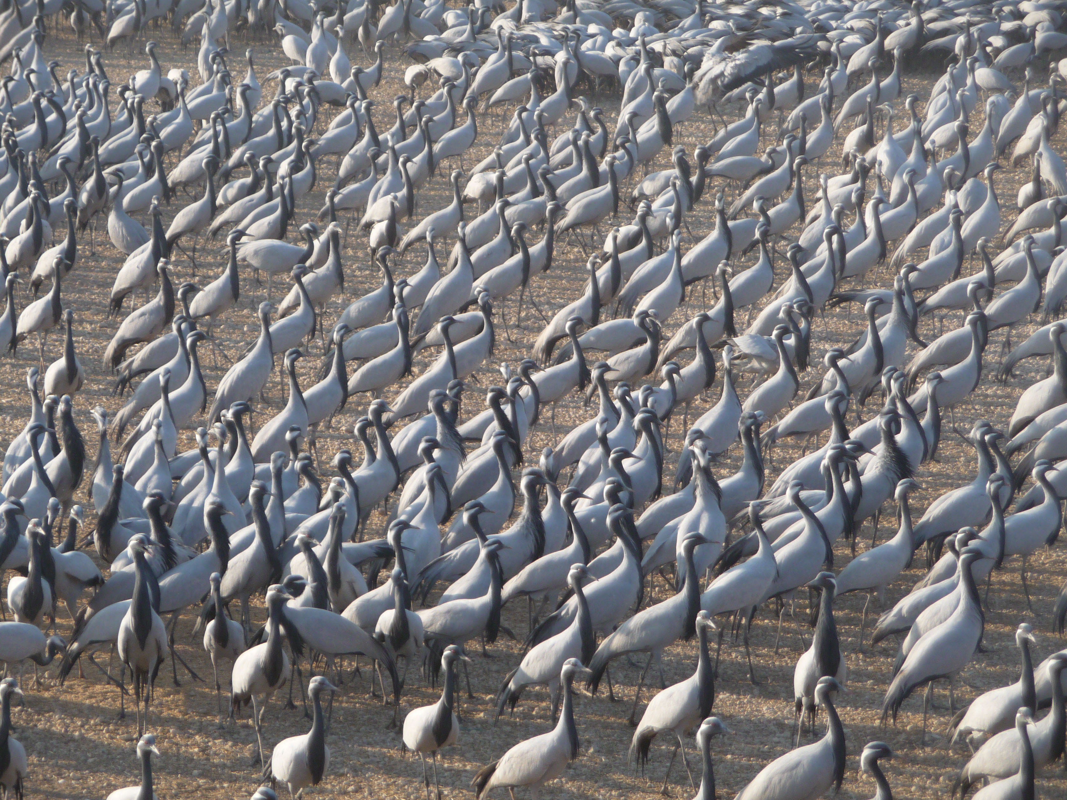 In a dry, dusty, desert landscape, the clamoring of cranes seems so surprising. I am used to the great winter assembly of more than 10,000 cranes in Kyushu at Izumi, where they congregate on winter-fallow rice fields; and I regularly frequent the winter gatherings of Red-crowned Cranes in snowy eastern Hokkaido. I have dreamed, too, of witnessing the hundreds of thousands of Sandhill Cranes that gather on migration on the Platte River in Nebraska.This January, though, I realized another ambition when I visited the extraordinary annual gathering of Demoiselle Cranes in the desert state of Rajasthan, northwest India. There, the soil is dry, dusty or sandy. The winter vegetation is sere; scant tufts of short tawny grasses, heavily grazed by sheep and goats. There seems little to attract anything here, especially cranes.