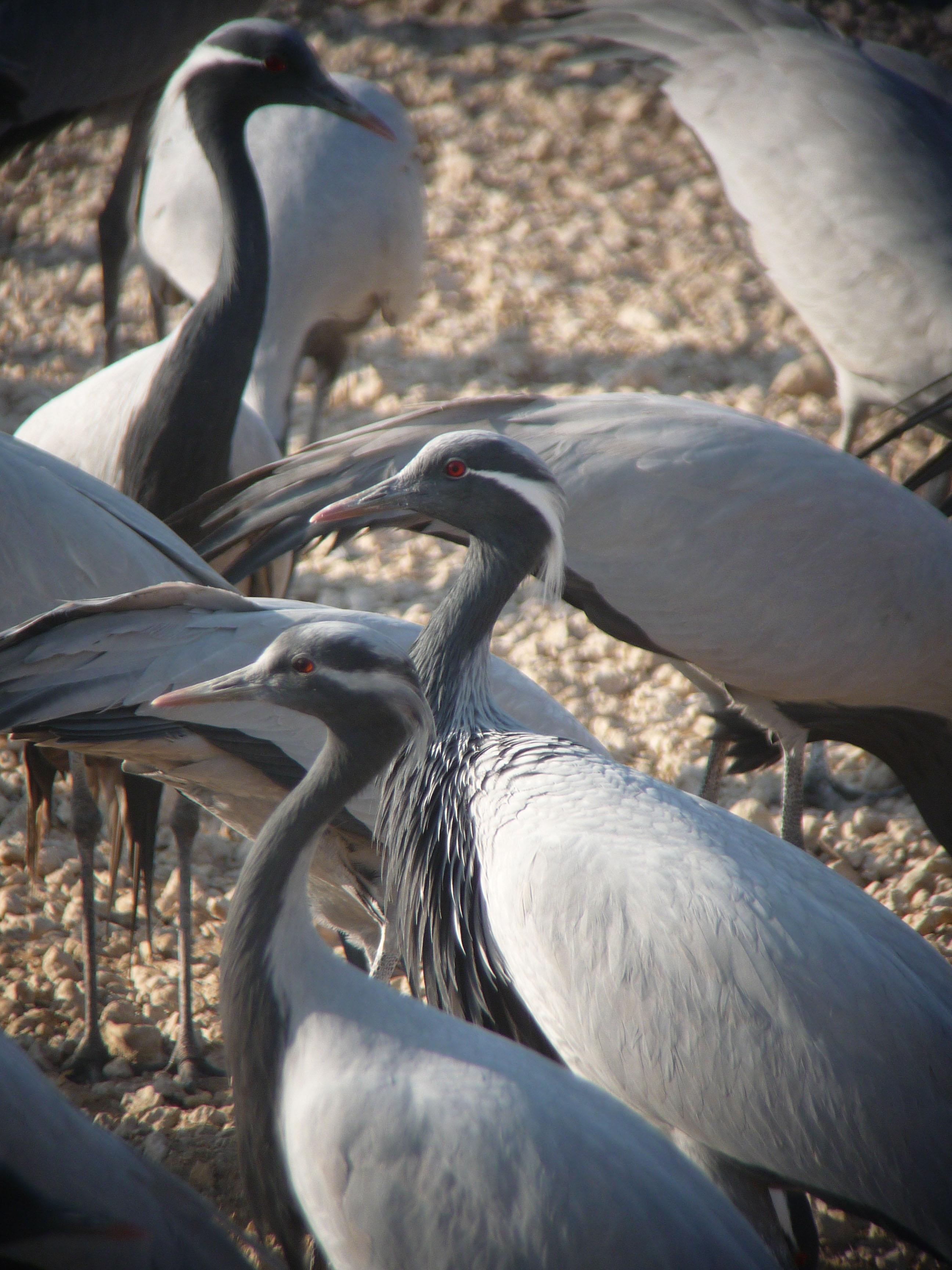 Leading their young, Demoiselle Crane parents pass over incredible barriers that include not only massive mountain ranges but deserts, too, as they flee the onset of winter in the northern hemisphere’s higher latitudes. Then they spend the winter months in areas that seem harsh to us yet offer them at least roots and bulbs to eat — and increasingly the waste from harvested crops. They gather at night to roost on isolated wetlands before fanning out prior to daybreak to forage across the desert and semi-desert landscape — except for those that gather at Khichan!