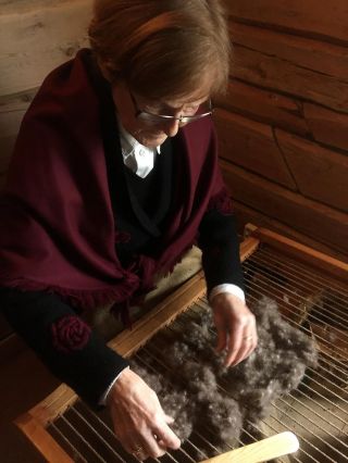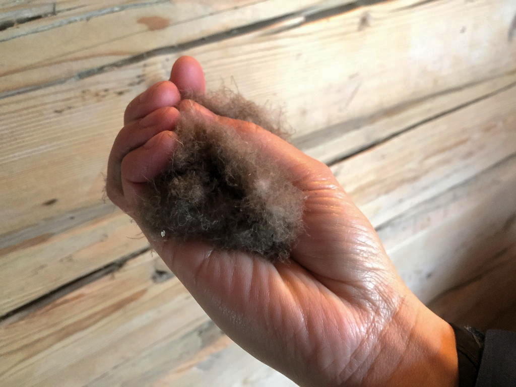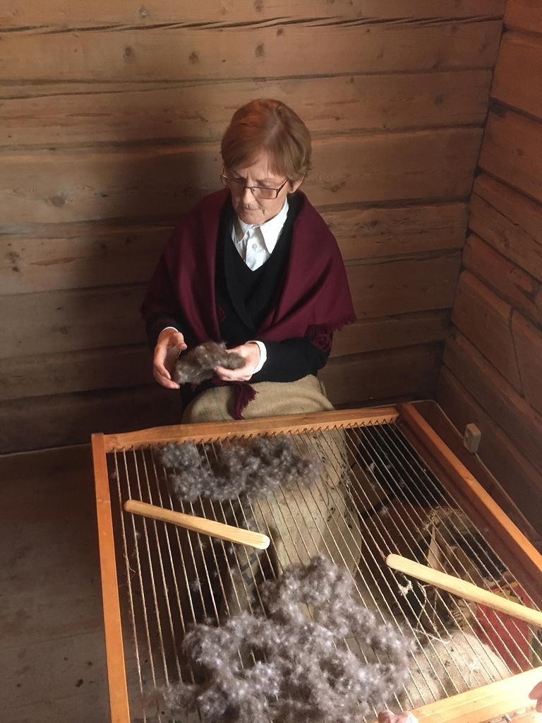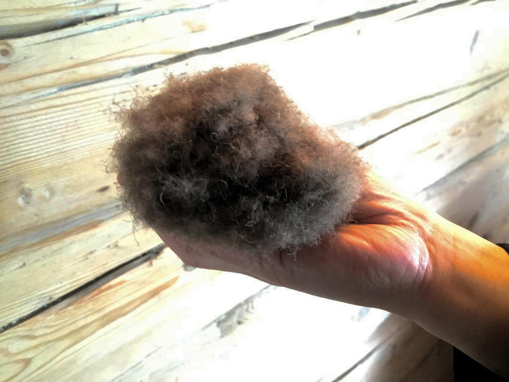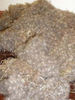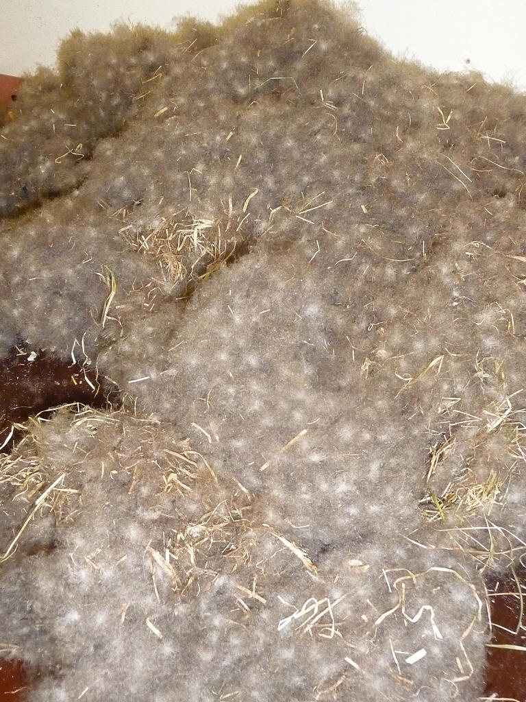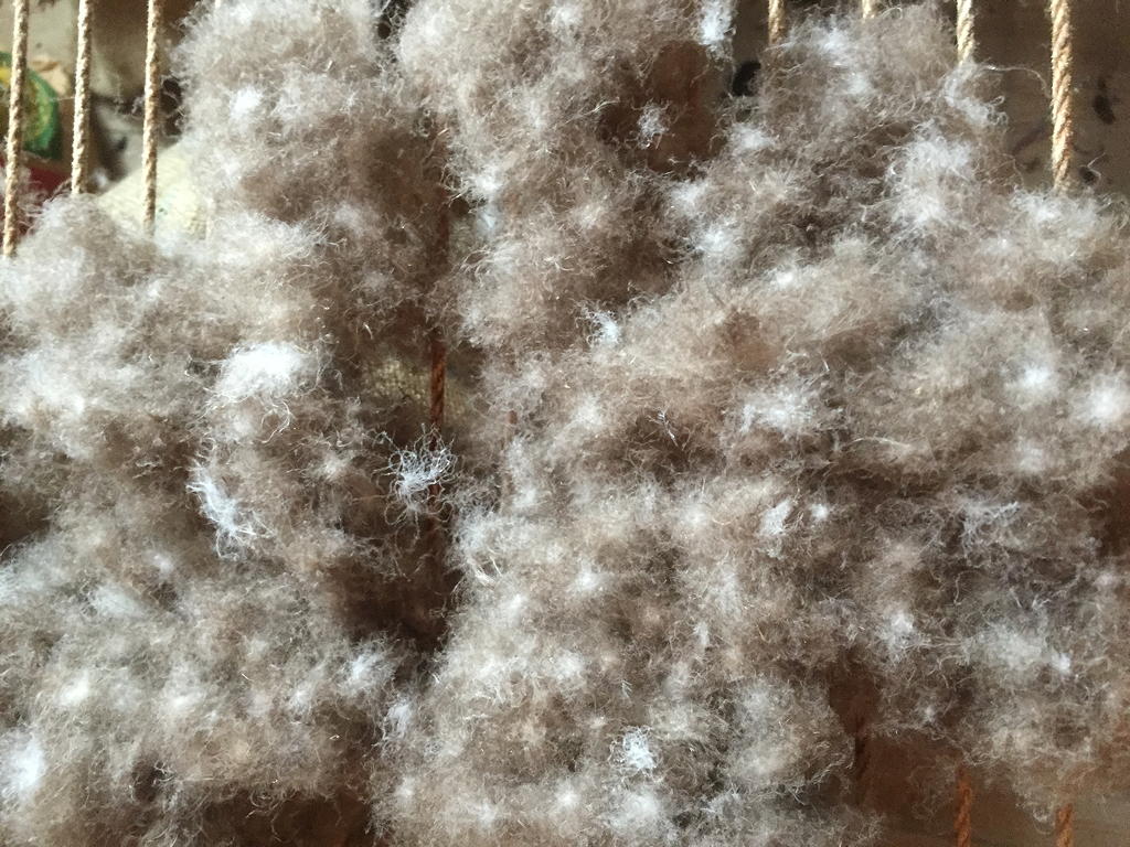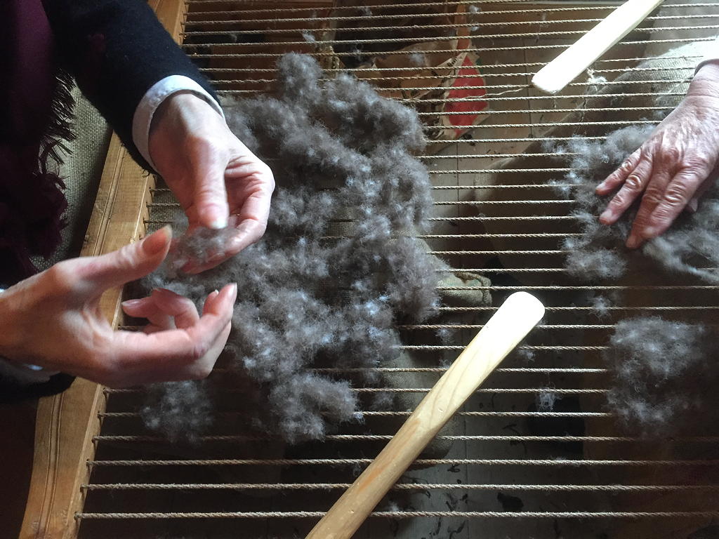 A small mound of harvested down is placed on to the strings of the horizontal harp and then it is “played”, not with the fingers, but with a wooden spatula-like instrument. Rubbing the tip of this instrument back and forth across the strings and through the down helps to tease apart the loose clumps of down and also loosens any contaminants that then fall through the strings of the harp into the waste basket below.