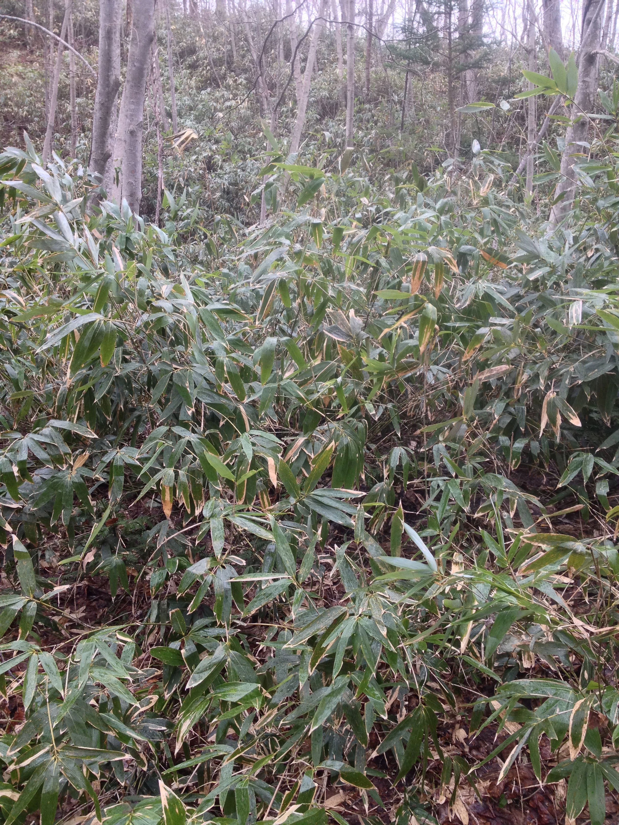 The enclosed atmosphere of a dense stand of sasa is as stifling and as mind-numbing as a sauna, and while laboring upslope through such a sweat-inducing horde of stems my anaesthetized thoughts circled around the absolute pointlessness of a plant whose sole purpose seemed to be to thwart my progress.