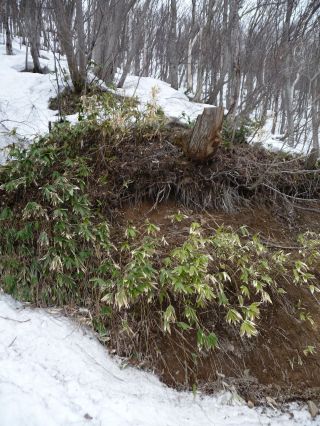 In due course winter finally wanes (albeit very slowly in the north and the mountains this year) and warmth finally returns to the land. As the depth of the winter snow pack steadily lessens, and as the thaw proceeds, the sasa lies patiently waiting. Likely its elongate, listless leaves are already taking advantage of wan light filtering through the snow layer above; photosynthesizing even before they are exposed to direct illumination.