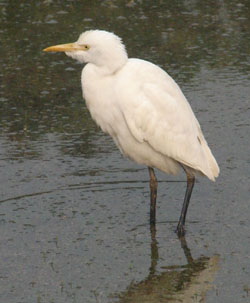 Cattle egrets are often found foraging in drier areas, around stock animals or following behind a plowing tractor or a harvester, but little and eastern great egrets are commonly encountered at the same time of day in the same habitat — along riversides and on estuaries.