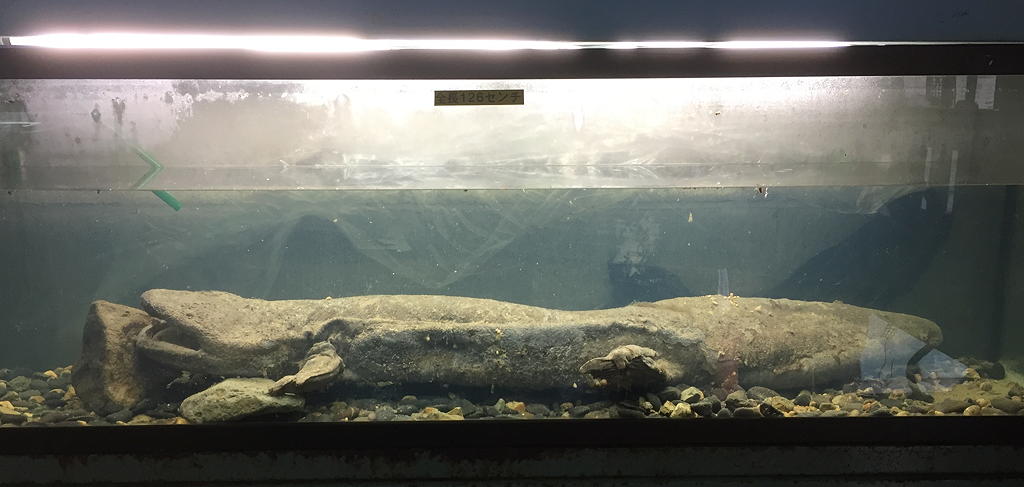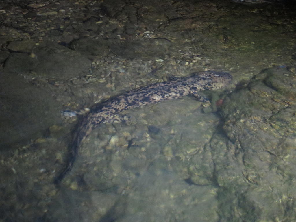 We settled in, made ourselves at home in our museum-like surroundings, and prepared ourselves for the adventure that had brought us to the valley – the presence of a record-breaker. A knock on the door came soon after eight o’clock; friendly faces greeted us and led us out and away from that “central” heating warmth into darkness and damp. From the point of view of the weather, it was a rather grim evening. Our quest in that valley was the Hanzaki, an extraordinary creature that I had only encountered once before one dark night back in September 1993. Outside the region the Hanzaki is better known as Ōsanshōuo (オオサンショウウオ), a name that can be translated literally as “Giant Japanese Pepper Fish”, but we generally know of it as the Japanese Giant Salamander.