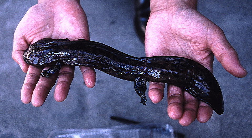Broadest at the head, with a rounded snout and no discernible eyes, and seemingly neck-less, its body tapered back to a laterally flattened tail. Its stubby limbs were relatively tiny with four digits in front and five stubby toes behind. It was difficult to estimate its size in the poor light and rippled water, but we guessed it was close to a metre in length. It wasn’t a record-breaker by any means, but this individual Old World creature was huge enough to dwarf the largest of the salamanders ever recorded in the New World – the Hellbender of North America.