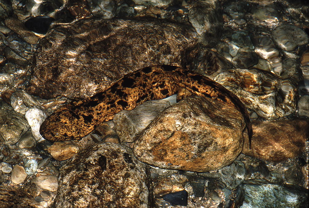 The water rippling over stones created a blurred mosaic. The streambed was an intricate pattern of shades of beige and brown, from pale sand to almost black in the shadows between the pebbles. It was possible to imagine all sorts of shapes and patterns there, in what seemed like an enormous, endless Rorschach inkblot. I’ve seen creatures in clouds and in the burning embers of a home fire, and could imagine them on that riverbed too. Scanning such a background plays tricks with the eyes. Suddenly, outlined against that mosaic there was a very different shape. Or was it just imagination, a pattern created by ripples? Its colouration was also a range of shades from sandy beige to blackish-brown, but in the light of our lamps I quickly realised that it cast an unmistakeable shadow that revealed an immensely elongated shape. This was no Kappa; this was Hanzaki, a giant salamander no less.