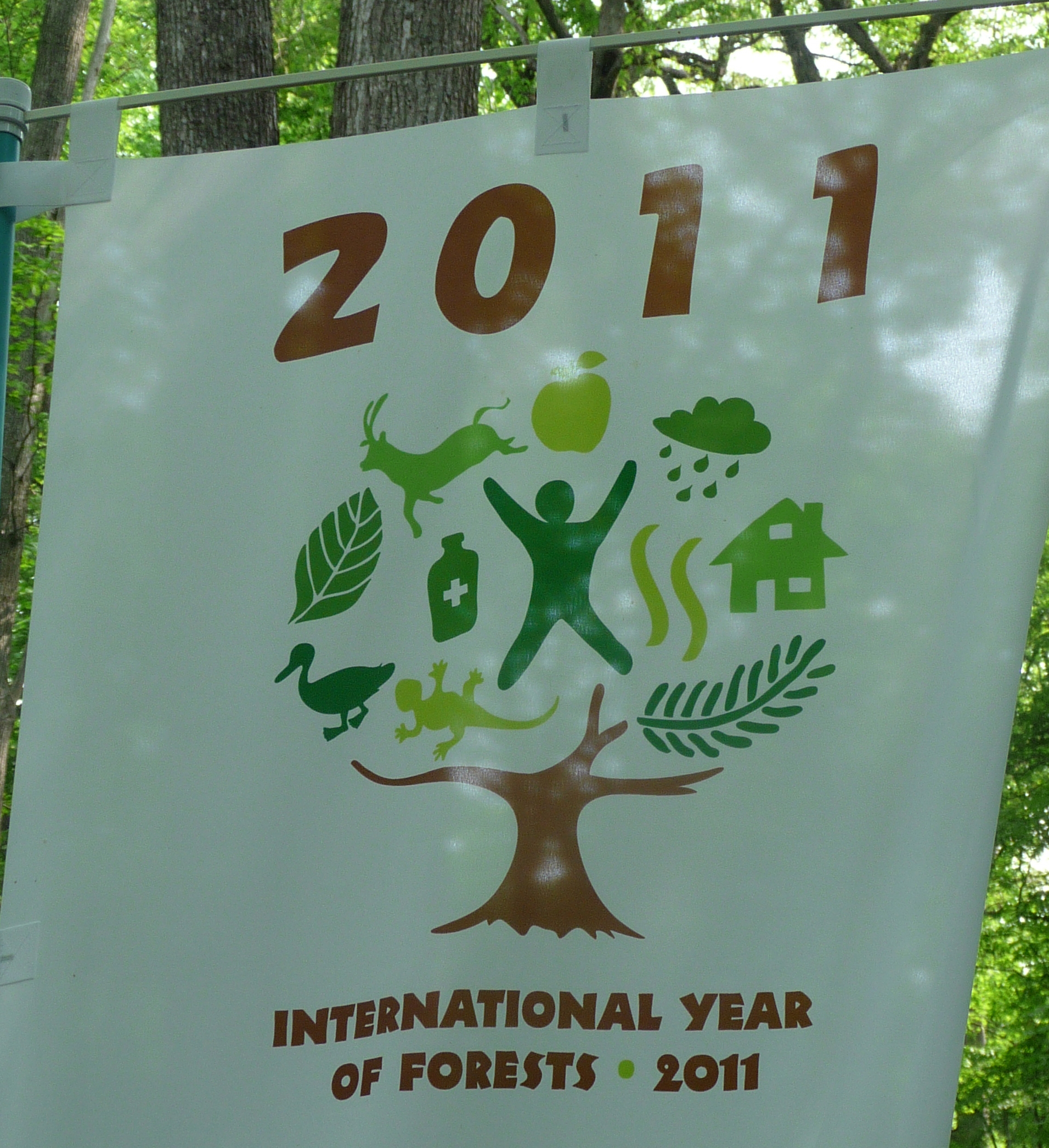 As I entered my local forest yesterday, I noticed a fluttering banner flag near the entrance that read: “International Year of Forests 2011.” The simple logo cleverly celebrates the theme of this U.N.-designated year, which is that people are central in the sustainable management, conservation and development of our forests, since the elements of its design show how forests not only provide shelter for people and habitat for biodiversity, but are also sources of foods and medicines and help provide clean water; furthermore they play a vital role in maintaining a stable global climate and environment.