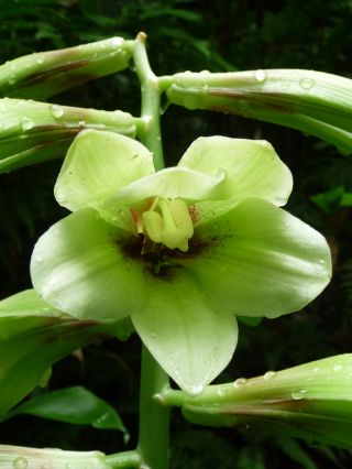 In contrast, familiarity comes through watching, week after week, for ongoing processes such as the glossy-leaved stems of Heartleaf lilies (Cardiocrinum cordatum) slowly inching their way skyward. Straight and tall, they eventually break buds near the tops of their stems, a meter or more above the ground, that are elongated vertically like stubby green fingers. It may take them 10 years to reach this flowering stage after early each year producing rosettes of large glossy leaves, then growing a little taller, and all the while storing energy underground in a bulb in readiness for a stronger burst of growth the following year.