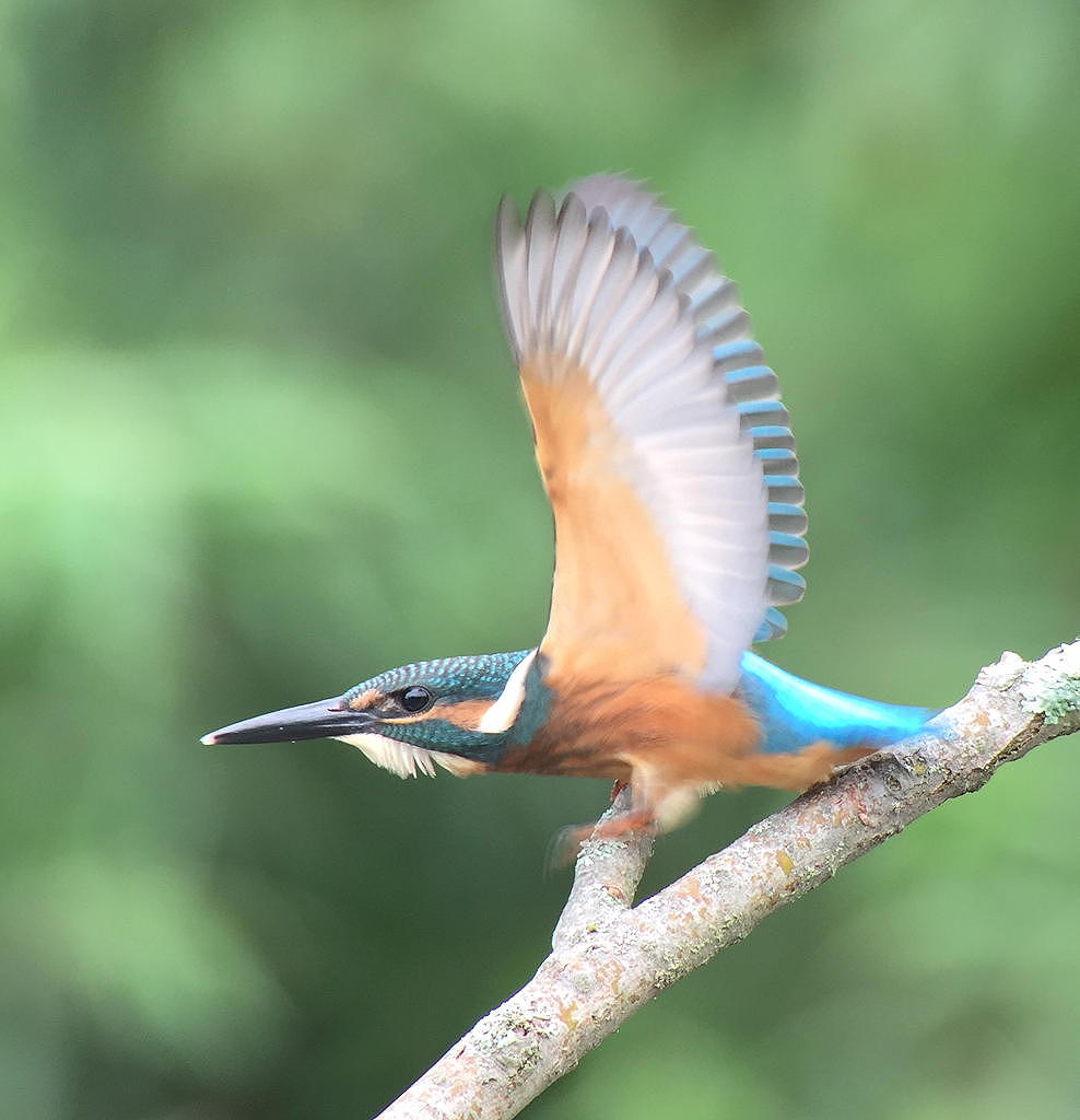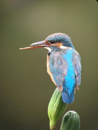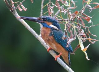 Kingfishers belong to a group known as Coraciiform birds (this group also includes rollers, ground rollers, hornbills, and bee-eaters), but of these it is the kingfishers that are the best known in the northern hemisphere. Coraciiform species, though diverse in form, size and structure, share a range of features in common; they are, for example, carnivorous eating small fish, amphibians, reptiles, small mammals and insects. They are also cavity nesters, digging their nest holes in banks or rotten trees, and strangely they share an unusual arrangement of their toes. Whereas most birds have three separate forward toes and one hind toe, allowing them to perch easily on branches, in these Coraciiform birds the anterior three toes are conjoined for part of their length, in an odd condition known as syndactly. Look closely at any photograph of a kingfisher and you will notice that the longer forward toe is fused to the adjacent toe. It is said that such fused toes are helpful when excavating a nesting tunnel.