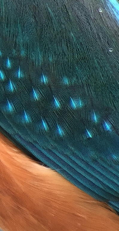 The jewel-like feathers of the kingfisher seem to glow, and well they might, for their colours seem alive, yet their blues are the result not of pigmentation but of the light striking the internal physical structure of the feather. Lured by their seeming glowing brightness Victorian-era milliners were bent on incorporating their feathers or even entire wings or birds into clothing and hats, and taxidermists were intent on filling table-top glass domes with their colours, but sadly, away from direct light, they lost their lustre, and the hunting of kingfishers, thankfully, faded like their dead colours. During my halcyon days spent with the kingfishers, I watched repeatedly as their colours shone in the sun or faded in the shade and followed their frequent interactions as they fought for territory or fought for food.