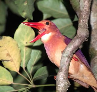 Japan’s Ruddy Kingfisher is a spectacular creature. It can be secretive and elusive in its forest habitat, but its haunting, rippling call – a long descending whistle – rings out repeatedly at daybreak through the humid forests of Okinawa and Amami Oshima and northwards into Honshu. Elusive and nervous during daylight, it rarely stays still long enough to show off its gorgeous colouring, but it can sometimes be found roosting quietly at night, when it can be watched at leisure. Then, its burnt-orange plumage can be seen to have a strong sheen of iridescent violet shimmering across its crown, breast and wings. Its syndactylous feet are a bright orange, and its enormous beak is of such a redness that only resurrecting the term sealing-wax red will do to describe it.