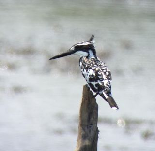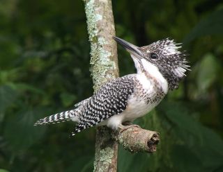 The huge 42 cm long Crested Kingfisher of Japan almost matches Australia’s kookaburra in size. It goes by the scientific name Megaceryle lugubris, which literally means the mournful great kingfisher, paying homage to its supposedly sombre plumage. Although appearing entirely grey at a distance, a close view reveals that its seemingly sombre greyness is actually a detailed study in black and white, the white as fine spots and bars across the black. It’s large headed appearance is exacerbated by its ruffled, double crest, which it raises frequently as it calls.