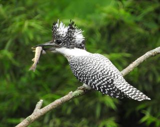 The unique fish-eating habit with which we associate the kingfishers, belie the fact that as a group they feed in a wide range of ways. Some of those in Southeast Asia and Africa occur in lush, humid forested habitats wherein they search for prey from a high vantage point before swooping down to the ground to snatch an insect or other invertebrate or a small vertebrate from the forest floor; others meanwhile splash recklessly into woodland ponds. At one extreme there are kingfishers that occur exclusively in dry land habitats and live as insectivores, whereas others feed exclusively from the water, and one, the Pied Kingfisher will even fish at sea. Many of the kingfishers hover briefly before splashing down onto prey, but the Pied Kingfisher of Africa, South and Southeast Asia has taken hovering to perfection and seems to favour aerial fluttering to hunting from a fixed perch.