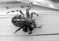 The spider had built a large web across the front of a dense laurel hedge. Meanwhile, a wasp, which had been bothering me as I ate an apple, blundered into the web. The spider’s response was swift, as it rushed across its web and then with a swirl of silk ensnared the wasp. The spider spun the wasp between its feet, wrapping it around until it was soon cocooned in silk. Next, the spider dragged its victim from its web to a shadier spot beneath a leaf, where it pierced it and sucked it dry. The remnant of the spider’s meal was a rounded black-and-yellow bundle about half the size of the original wasp.